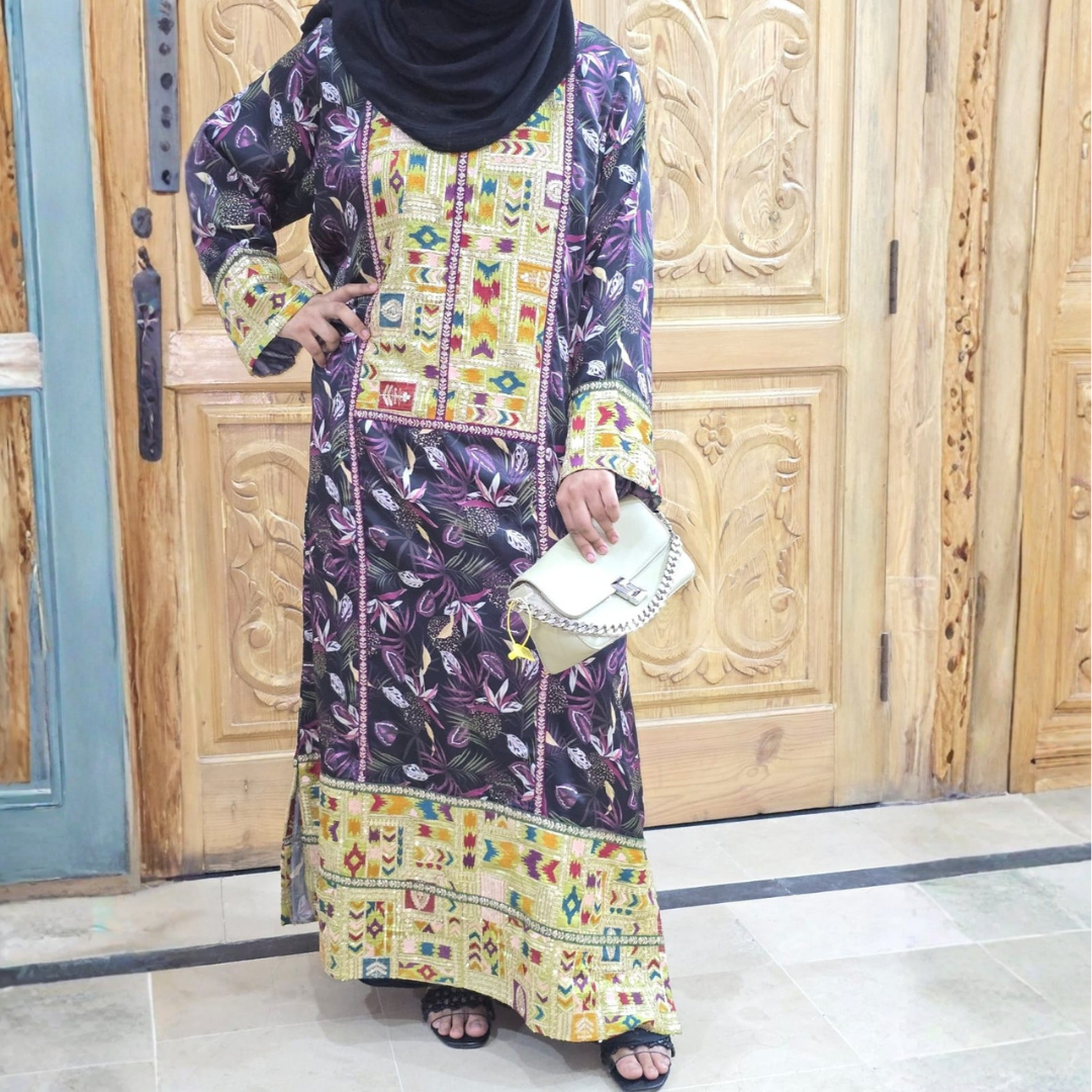 Crafted from luxurious printed silk, this abaya showcases a soft black base with delicate floral prints, creating a timeless and sophisticated look.