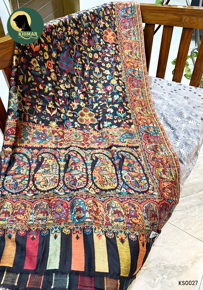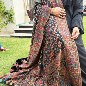 - Made from fine wool or luxurious pashmina, this shawl offers unmatched softness, warmth, and sophistication. The rich multi-shade detailing stands out beautifully against the black base, making it ideal for festive wear, cultural events, or elegant evening attire.