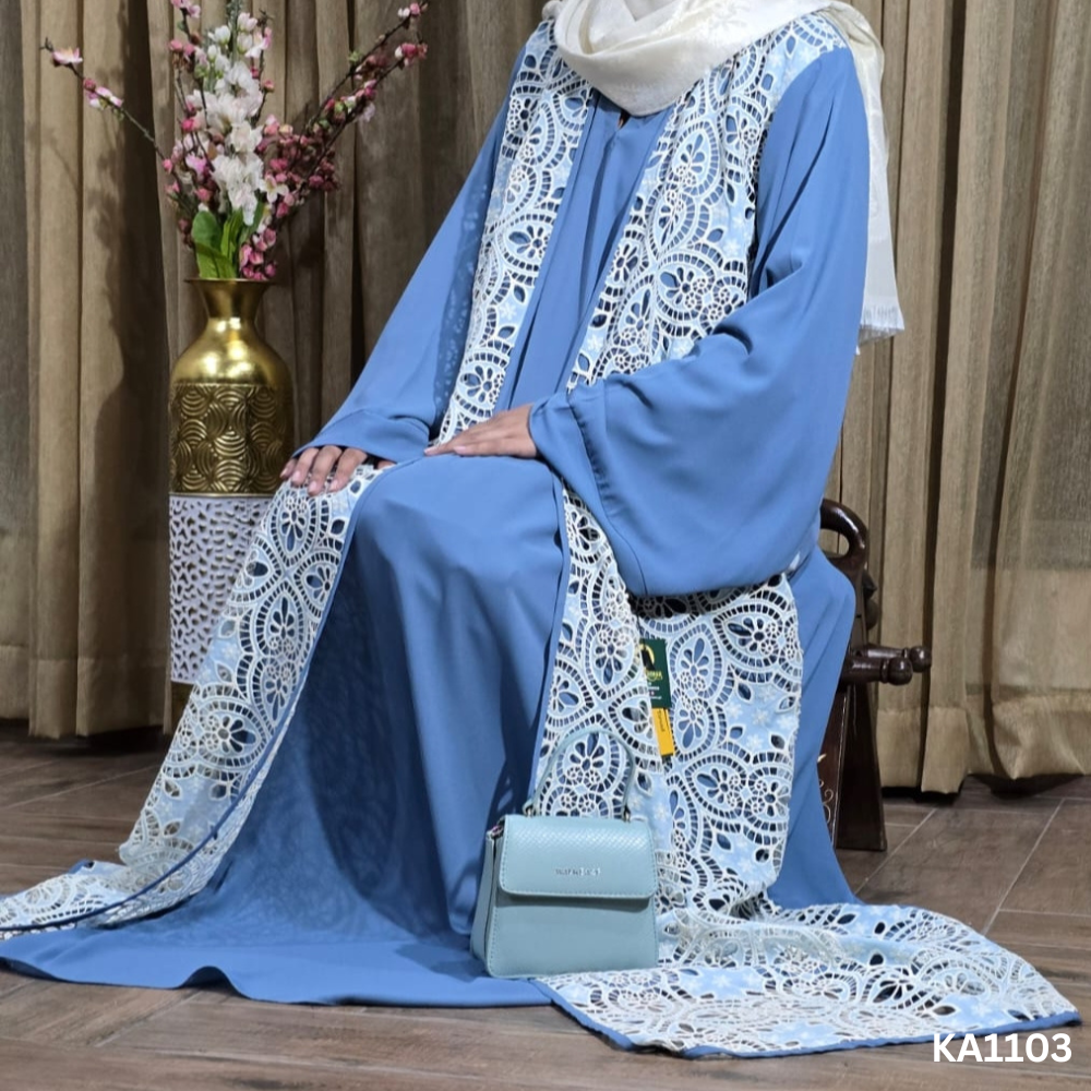 - Elegant Design: The Frosted Sky Abaya showcases a stunning front-closed silhouette crafted for modern women who value modesty and refined style. Its soft greyish-blue georgette base is elevated by a beautifully detailed white cutwork upper, creating a graceful layered effect that adds depth and charm.