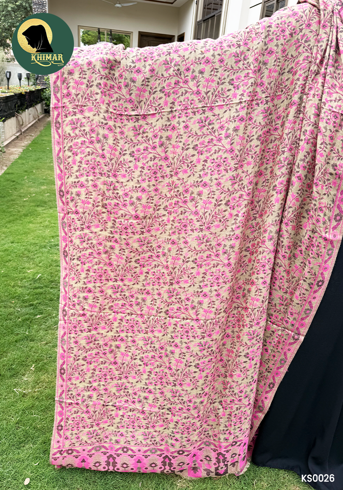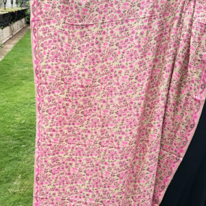 - This grey and pink shawl blends elegance and warmth effortlessly, making it an ideal accessory for both festive occasions and everyday wear. Rooted deeply in tradition, it offers comfort, style, and a connection to the art of Kashmir’s finest artisans.