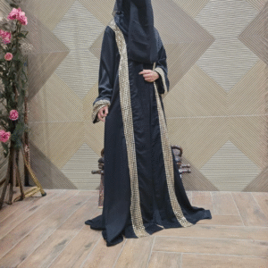 The Midnight Gleam Abaya features a refined upper-style design, offering a graceful layered silhouette that can be styled effortlessly with your preferred inner.