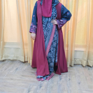 The Rose Radiance Abaya features a refined saree-style design, blending traditional charm with modest elegance for a beautifully draped look.
