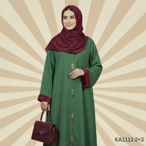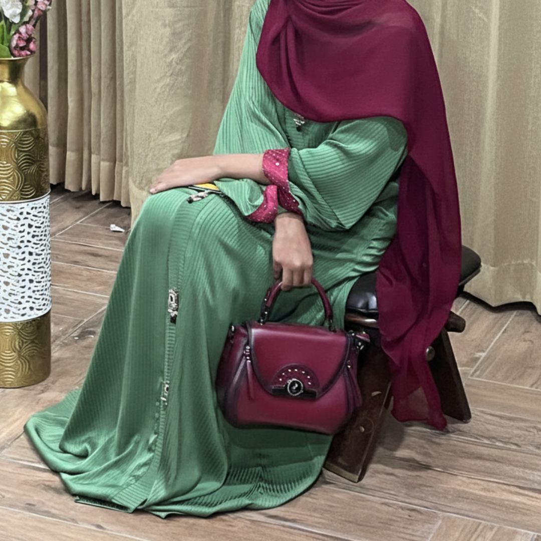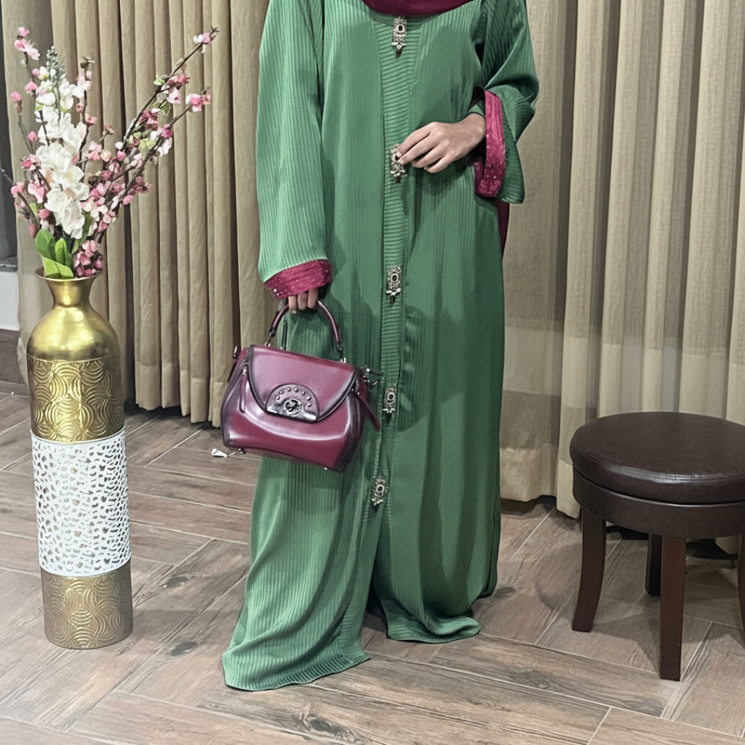The Royal Sheen Green Abaya features a refined front-open style, offering a graceful silhouette with a modern yet modest appeal.