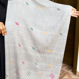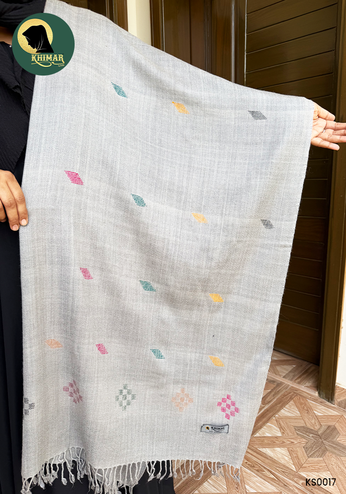 - Stay cozy and stylish with this grey woolen shawl, designed for comfort in cooler weather. Made from soft and warm wool, it features light, neat embroidery that adds a touch of elegance without being overly ornate.