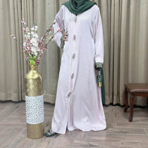 Royal Sheen Peach Abaya | Front Open Striped Silk Abaya with Fancy Button & Sheesha Silk Sleeve Detailing | Elegant Fancy Abaya for Festive Wear